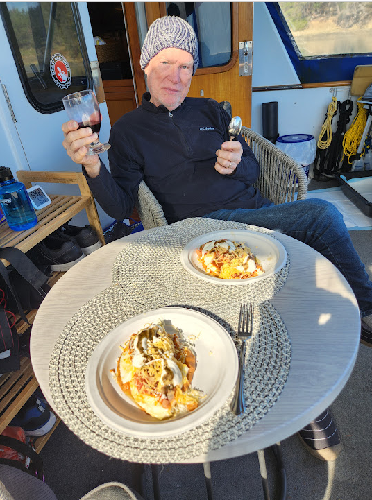 Delightful to state the obvious… In the morning: Hunter Bay Huevos Rancheros was served in the sunny cockpit. (Oh sure… a tosh of red goes well with breakfast whatever time it is served. In this case nearly noon.):
