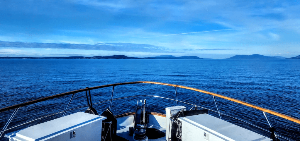 Our passage crossing Juan de Fuca was uneventful. Well… except for the slalom course created by the number of logs and large bits of prop busting wood floating on the water. But still… it was a fine passage. The weather was mild. Great Northern functioned well for the most part (we had an odd issue with the electronic engine controls, but they continued to work just fine).