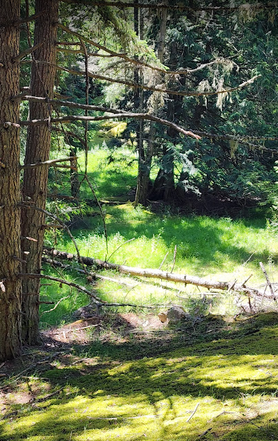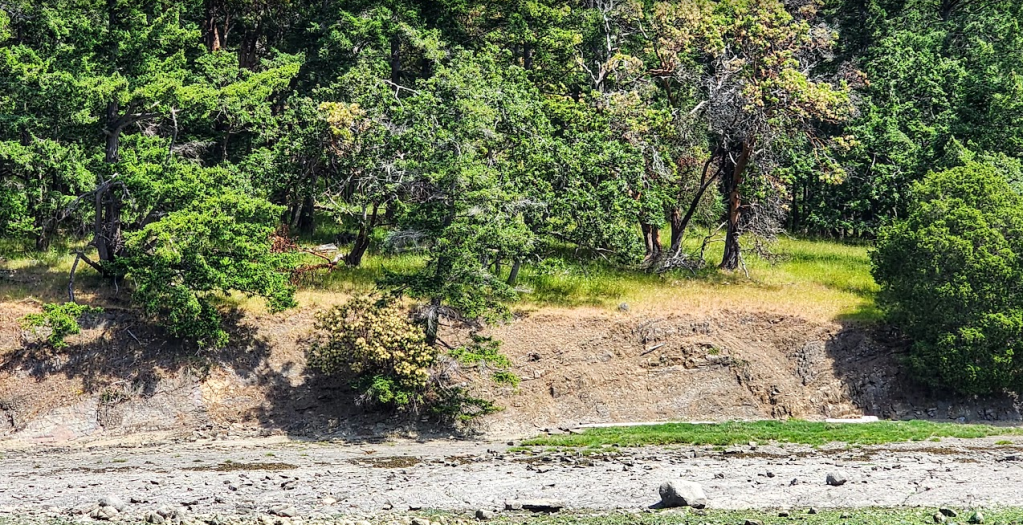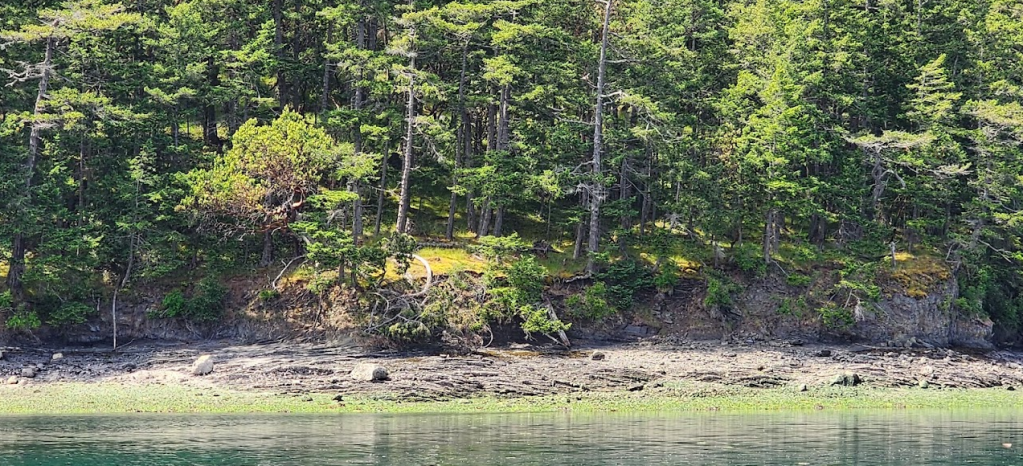Across the harbor to the South lies a ridge of harder rock that separates Prevost from Reid Harbor. The shoreline is sandstone and It is wooded with Douglas fir, Sitka spruce, big leaf maple, western red cedar and madrona. Occasionally you see other native trees such as western hemlock, grand fir, Pacific yew, and Dogwood. The forest is not as thick as what you see on the mainland because there is far less top soil in the islands in general. Meadows and other grassy areas are common. Bird life abounds.