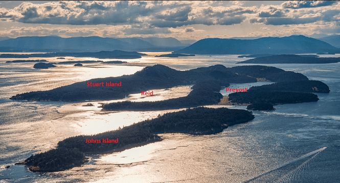 Stuart Islands current resting place places it as the most Westerly Island within the San Juan Archipelago. Geologically, It is composed of closely folded sedimentary rocks, mostly sandstone and siltstone that are the remnants of an ancient river delta modified by uplifting caused by tectonic plate incursion, earthquakes, vulcanism, landslides, ocean currents, rain and wind. Geology at work here people! Currently, the island sports two ridges of harder rock that lie in an easterly to westerly direction. In-between them, softer sandstone and siltstone are found. During the last period of ice age glaciation, of which there have been many, the encroaching mile high ice sheet gouged out the softer stone which was eventually flooded by the sea. The result for this epoch: two fine harbors: Reid and Prevost. Both are on our personal list of favorite anchorages. They are well protected from all but the most robust wind events and the holding in mud and sand is excellent. Let the wind blow, lay out a bit more chain and crack open a beer. That’s the spirit!