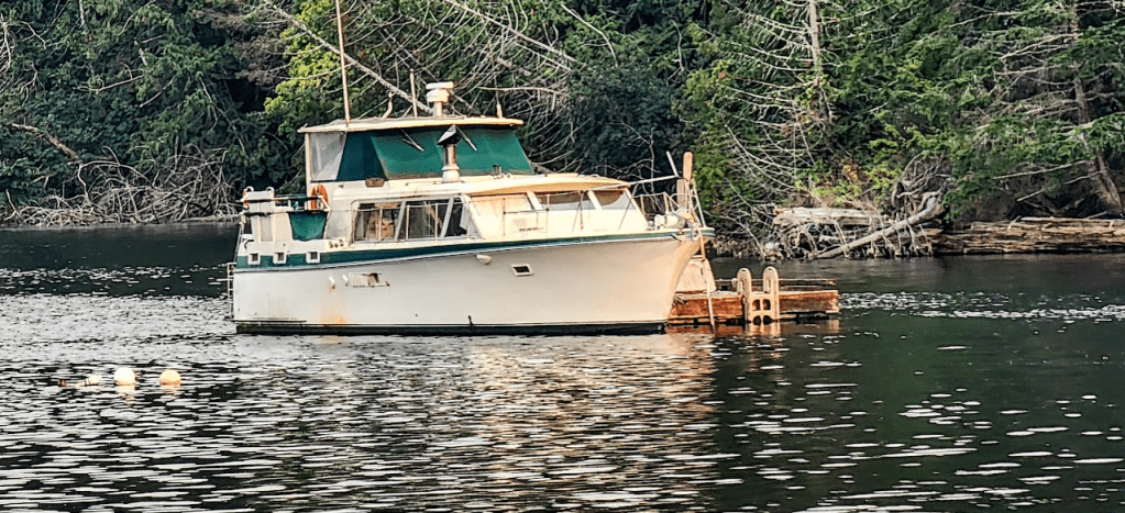 First glance upon arrival was to discover that there were no addled hippies nor piratical looking sapiens lurking about preparing to dispense unreasonable mischief upon new arrivals. There were roughly 16 boats, and there were no apocalyptical zombies dancing around a beach fire waiting for new flesh to arrive. The anchorage was… perfectly normal. Canadian normal. There was one boat, some kind of aging Chris Craft tied to an anchored dock. Perhaps it was a remnant hippie hovel that the park service thought would serve as an historical reminder of the distant past of anchorage digressions. Hard to say… as many Canadian anchorages have an aging boat or two destined to succumb to the whimsies of the sea.