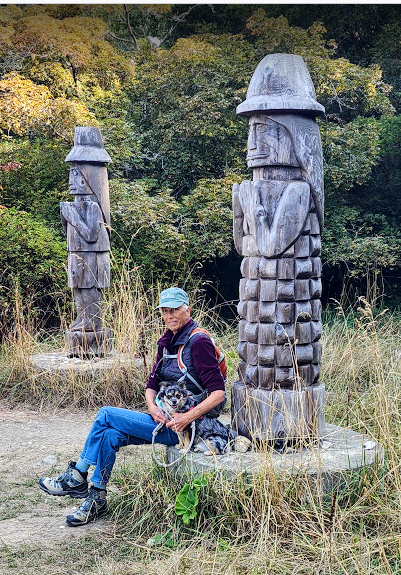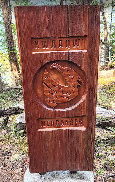 One of the many red cedar carvings present in the park that tie the indigenous language with its English counterpart.