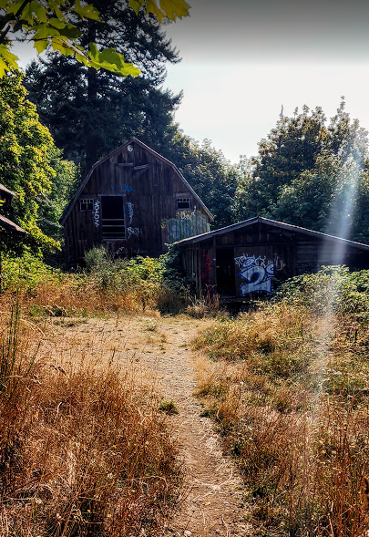 Amongst the salal, Oregon grape, swordfern, ocean spray, douglas fir, western red cedar, spruce and hemlock we ran across an old out building of the farm that once tilled the soils, raised alfalfa and grains for the cattle, milked the cattle and sold the milk to the villagers near at hand.