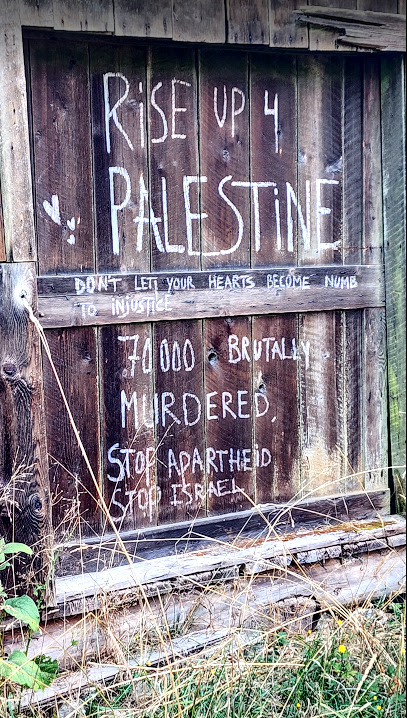 Now. To start with… this is Canada. It may be where you live, and it may not be. And… I make it a point of attempting to keep my political and religious views… out of this blog. With that statement, my first observations: There are no misspellings. The three points stated are clear, concise, and most likely heartfelt considering how clearly they were written. In the “margin” painted on a wood slat that holds the door together is the statement: “Don’t let your hearts become numb to injustice”. I didn’t focus on that until I’d read the larger printing.