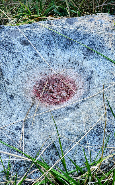 A metate… just a sittin there bold as brass. So the metate in this case is real and was most likely used by the Halkomelem to grind up acorns, grains, nuts and whatever else they had a mind to grind. I’m not sure what the red stuff is, but it is not part of the original use story, or is it?