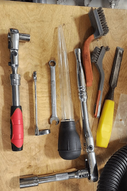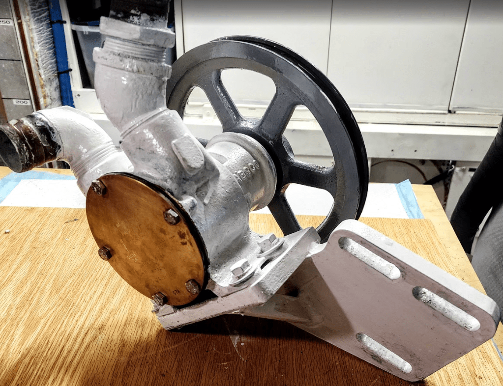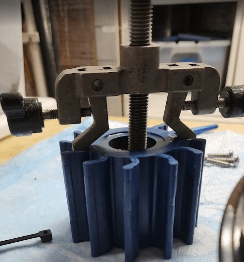 Part of the fall maintenance program includes changing the oil on both engines and gen sets if warranted. The oil change process is straight forward. The hardest part is unscrewing the old filters. Mischief managed. New oil and filters are in place. That left the impellers. I’d done both gen sets already which left the larger, harder to access 3208 Cat water pumps.